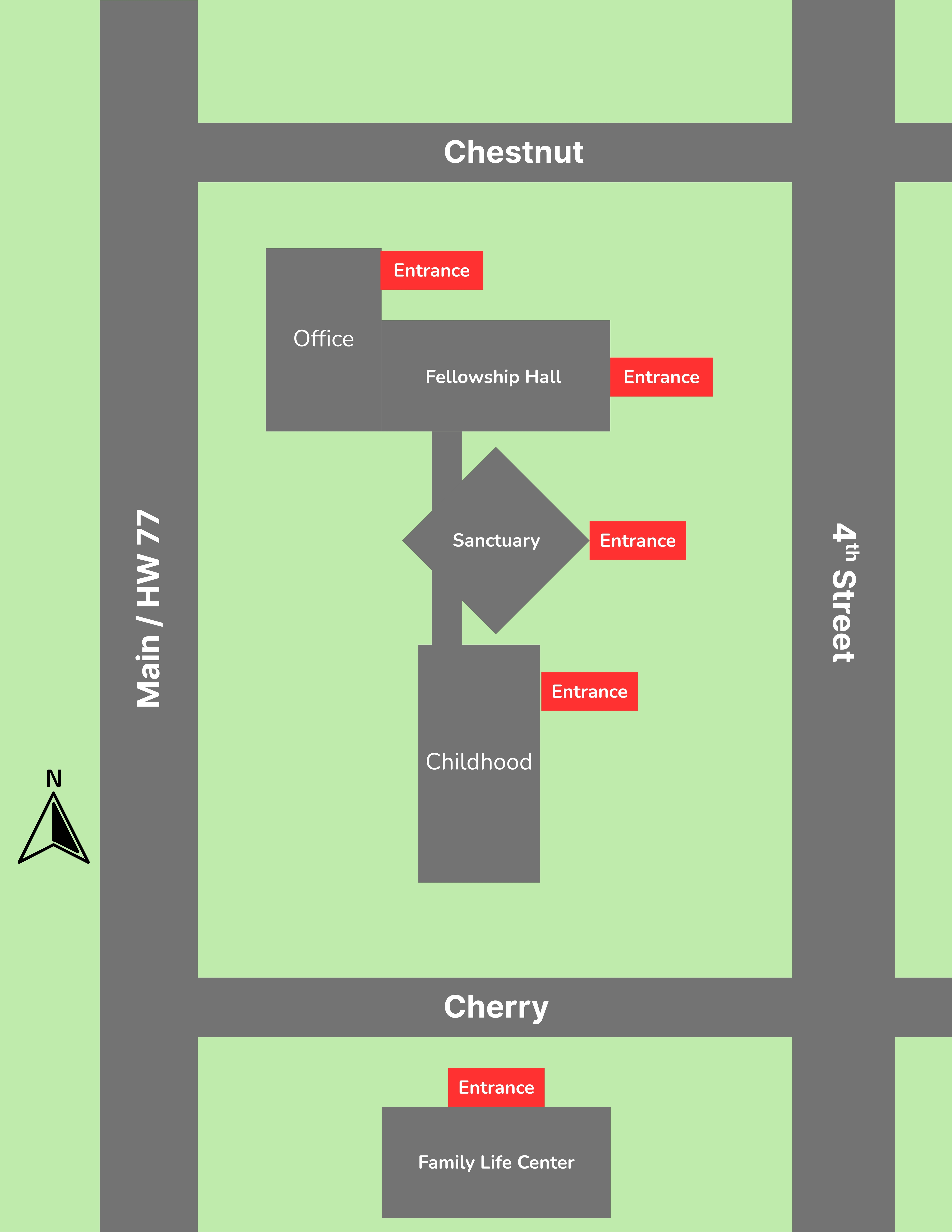 Parking is available throughout our campus, including on Main Street and around the Admin Building, located across the street from the church.